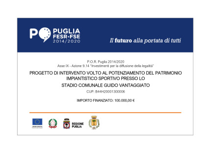 POR Puglia 2014-2020 Azione 9.14 "Investimenti per la diffusione della legalità" PROGETTO DI INTERVENTO VOLTO AL POTENZIAMENTO DEL PATRIMONIO IMPIANTISTICO SPORTIVO PRESSO LO STADIO COMUNALE GUIDO VANTAGGIATO - CUP: B44H20001300006 € 100.000,00