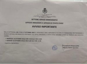 Nella settimana dal 13 al 17 ottobre 2025 il personale del Settore Servizi Demografici srà impegnato in una serie di corsi di formnazione propedeutici al passaggio alla nuova piattaforma...
